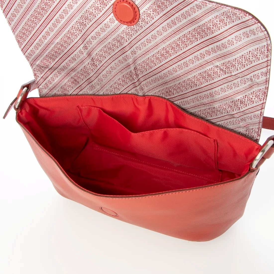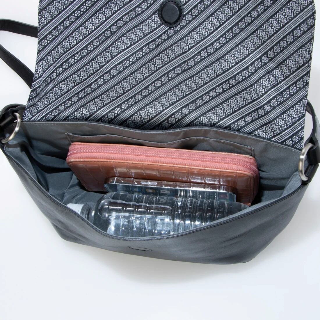 ナチュラルな染料染めにこだわったレザーをベースに、上質な博多織【斜め献上柄】をフラップ裏にあしらった軽やかなショルダーバッグ。レトロな感じも今はおしゃれな装いに。