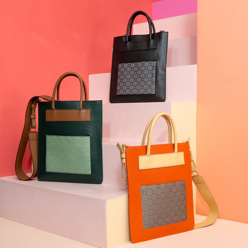スタイリッシュなデザインに仕上げたフラットトートバッグ。博多織を代表する『献上柄』を二つに分けたブロック柄に仕立て、フロントポケットに採用しました。A4サイズの書類や14インチまでのノートパソコンが収まるので、ビジネスシーンにも最適です。